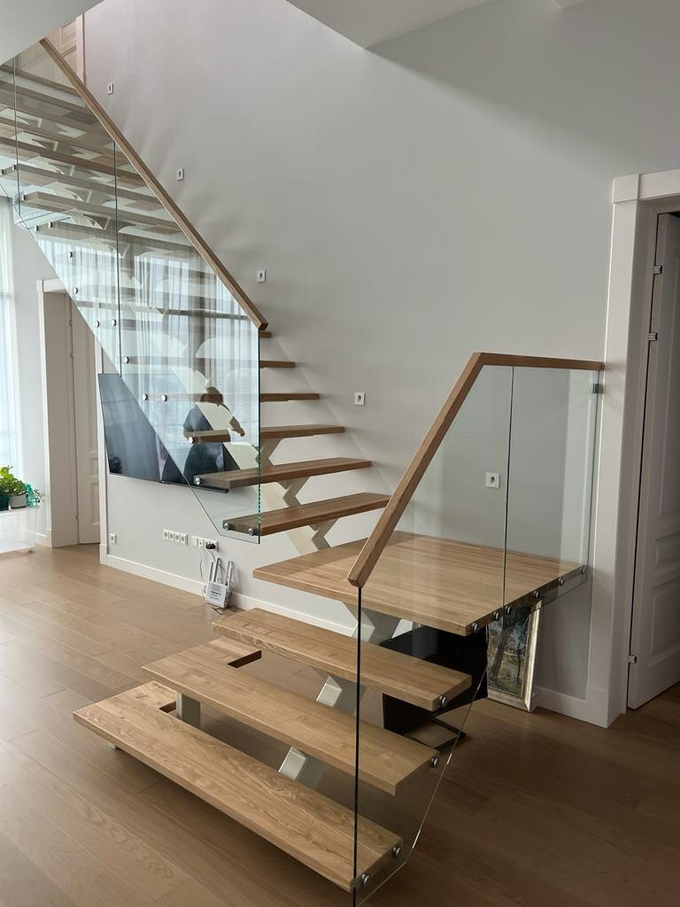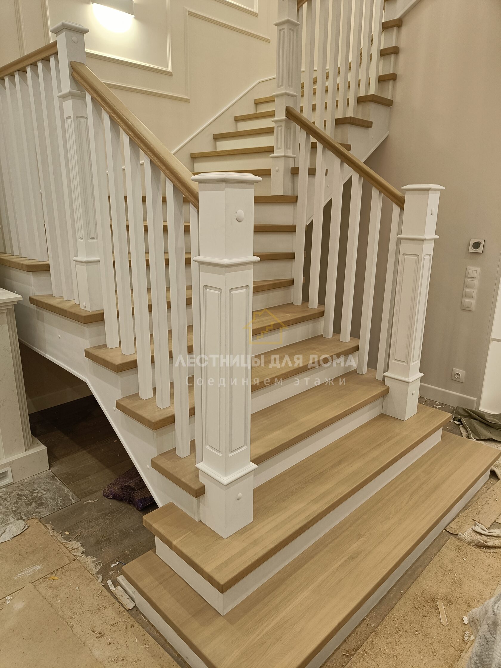 ✔️Осуществили облицовку каркасов дубом «экстра» цельноламельной склейки: ступени толщиной 40 мм, подступенки, фальшкосоур, сапожок, подшивка низа;
